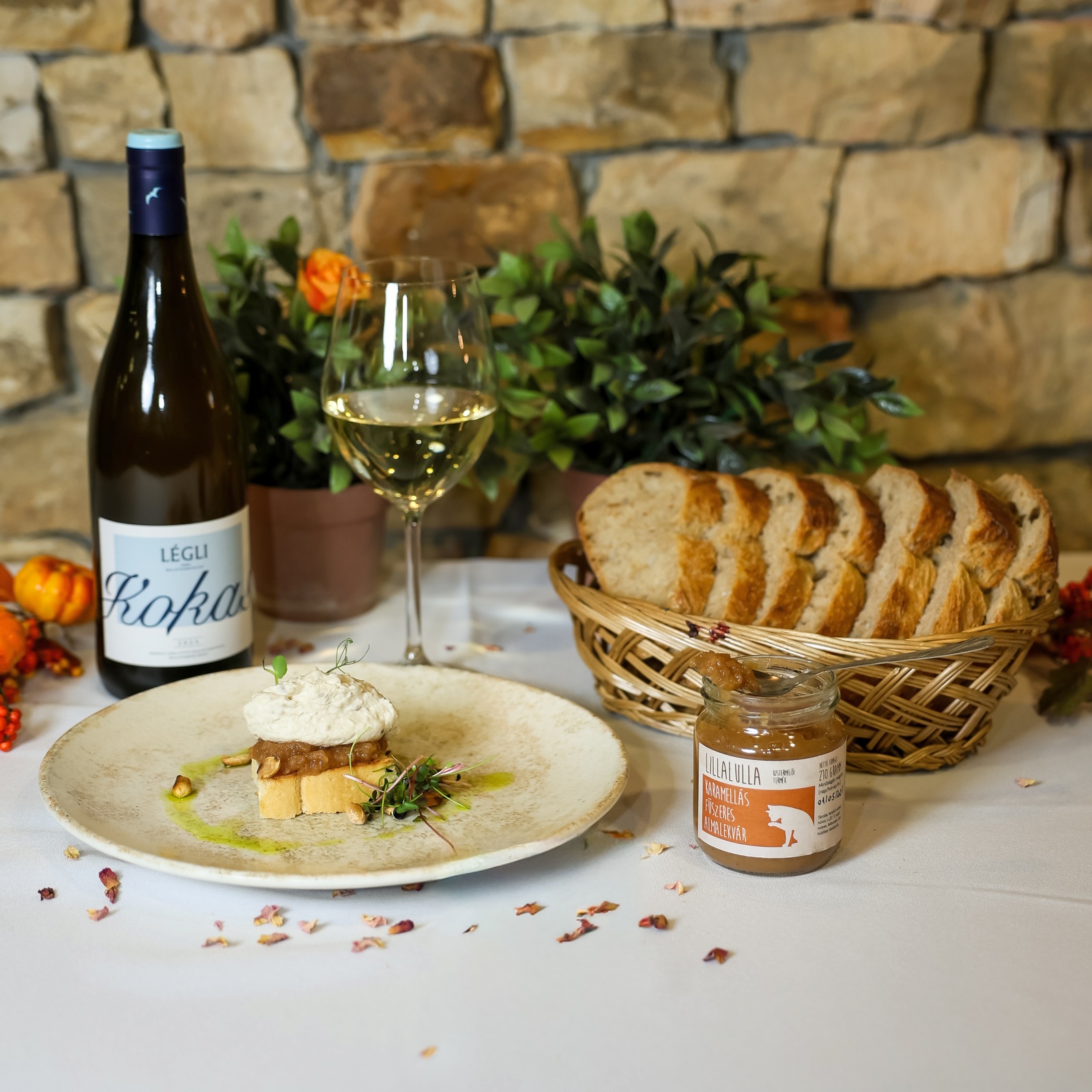 Lágy kacsamájmousse (Halker Kft.) karamellás, fűszeres almalekvárral (LillaLulla), pirított törökmogyoróval (LillaLulla) és édes fügével (Halker Kft.)